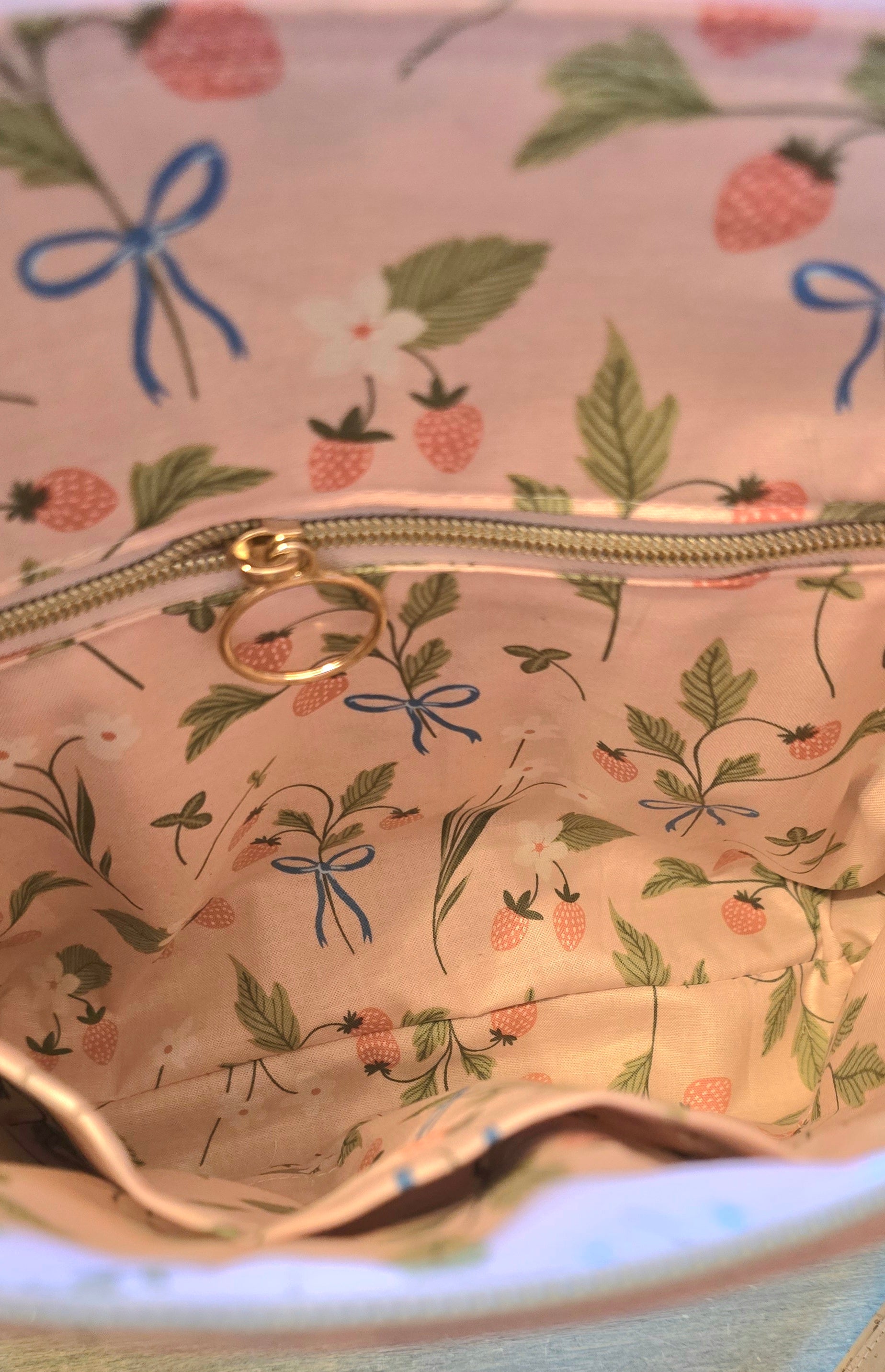 On the interior ; beautiful pink strawberry print, three slip pockets, and one zipper pocket.
